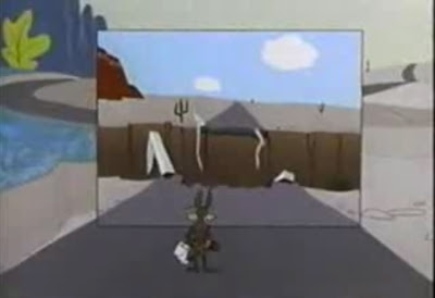 There is this, this jaw-drop, when Coyote finds a stretch of "normal" road and erects a canvas on which he paints a scene of a broken bridge over a chasm that isn't there. His previous paintings have depicted - and given the Roadrunner's use of them, actually brought about - a new functionality to an exhausted, abandoned landscape. Roads where old ones crumble away! Railway lines cutting through the mountains to get you to the families and jobs that do not exist! Coyote paints this break-down and waits for the Roadrunner, who sprints straight through it and the illusion. Frustrated, Coyote chases after him, expecting the painting to treat him as he's treated them all along, as flat surfaces set up on walls and in front of voids, something to be passed through with little resistance. And indeed, he encounters none, but wrongly. He runs into the painting and off the rails.